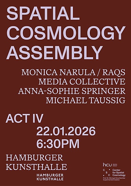 Der vierte Akt (22. Januar, Hamburger Kunsthalle) mit Monica Narula/Raqs Media Collective, Anna-Sophie Springer und Michael Taussig verwebt diese Fäden miteinander und konzentriert sich auf die Verflechtung kosmischer Vorstellungswelten und irdischer Antrengungen. Er schlägt Raum als ein dynamisches Netzwerk materieller wie immaterieller Beziehungen vor und fragt, wie räumliche Kosmologien in-mitten planetarischer Transformationen neu konfiguriert – und neu praktiziert – werden könnten.